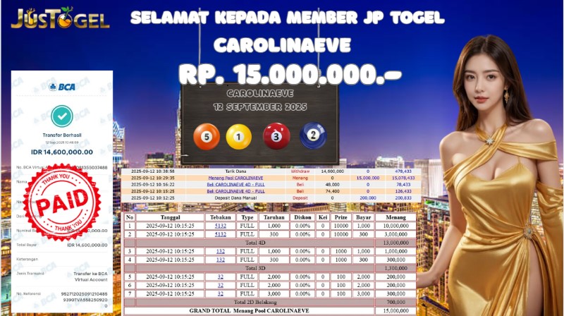 Selamat kepada User ID : MAS***TI Telah berhasil mendapatkan kemenangan besar pada Permainan JP TOGEL CAROLINAEVE Dengan kemenangan Sebesar Rp 15.000.000,- Setelah mengisi formulir withdraw dengan kurung waktu hanya 5-10 menit pihak JUSTOGEL sudah melakukan transfer kepada pemilik User ID dan dana sudah dapat di cairkan oleh pemenang. Bukti pembayaran yang kami berikan merupakan bukti pembayaran yang SAH / VALID yang langung di dapatkan melaui tanda transfer transaksi dari Bank yang di tuju.