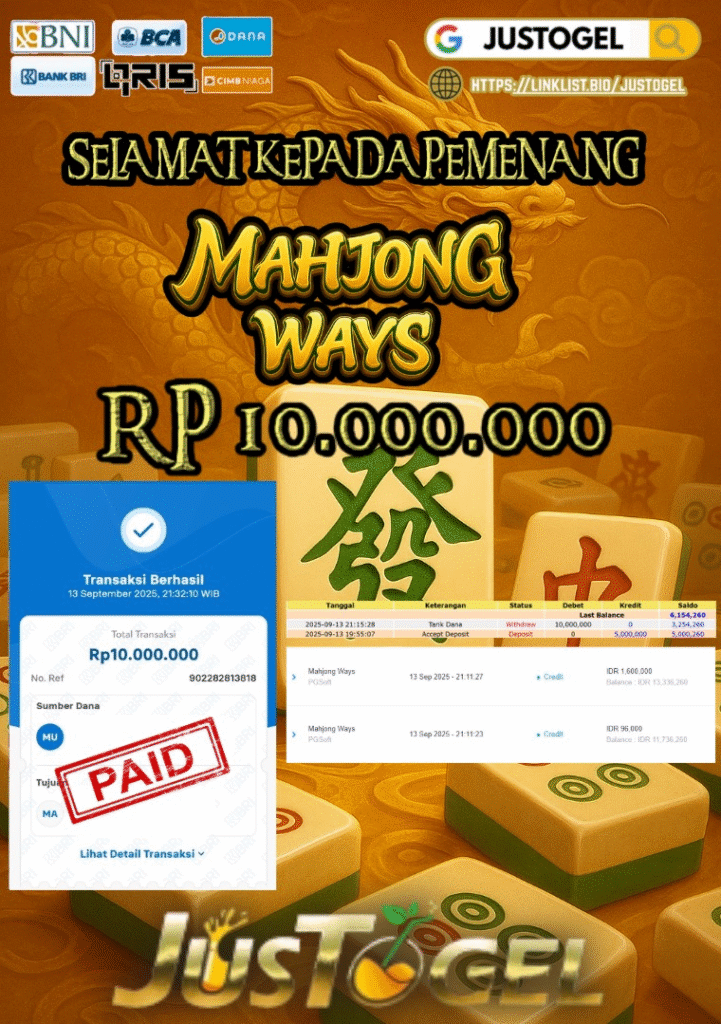 Selamat kepada User ID : MO***AN Telah berhasil mendapatkan kemenangan besar pada Permainan JP SLOT MAHJONG WAYS Dengan kemenangan Sebesar Rp 10.000.000,- Setelah mengisi formulir withdraw dengan kurung waktu hanya 5-10 menit pihak JUSTOGEL sudah melakukan transfer kepada pemilik User ID dan dana sudah dapat di cairkan oleh pemenang. Bukti pembayaran yang kami berikan merupakan bukti pembayaran yang SAH / VALID yang langung di dapatkan melaui tanda transfer transaksi dari Bank yang di tuju.