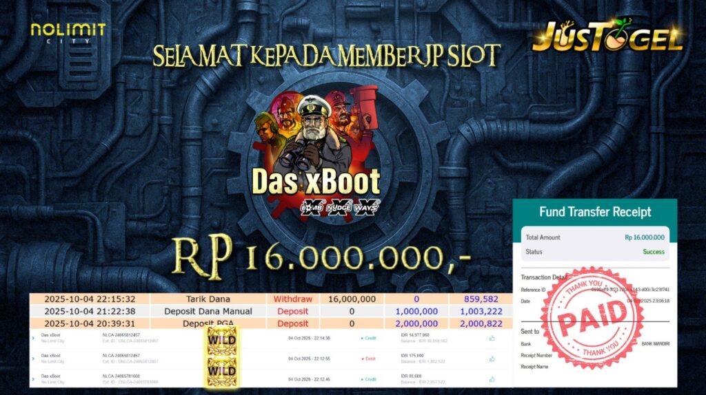 Selamat kepada User ID : CHYN***R62Telah berhasil mendapatkan kemenangan besar pada Permainan JP SLOT DAS XBOOT Dengan kemenangan Sebesar Rp 16.000.000,- Setelah mengisi formulir withdraw dengan kurung waktu hanya 5-10 menit pihak JUSTOGEL sudah melakukan transfer kepada pemilik User ID dan dana sudah dapat di cairkan oleh pemenang. Bukti pembayaran yang kami berikan merupakan bukti pembayaran yang SAH / VALID yang langung di dapatkan melaui tanda transfer transaksi dari Bank yang di tuju.