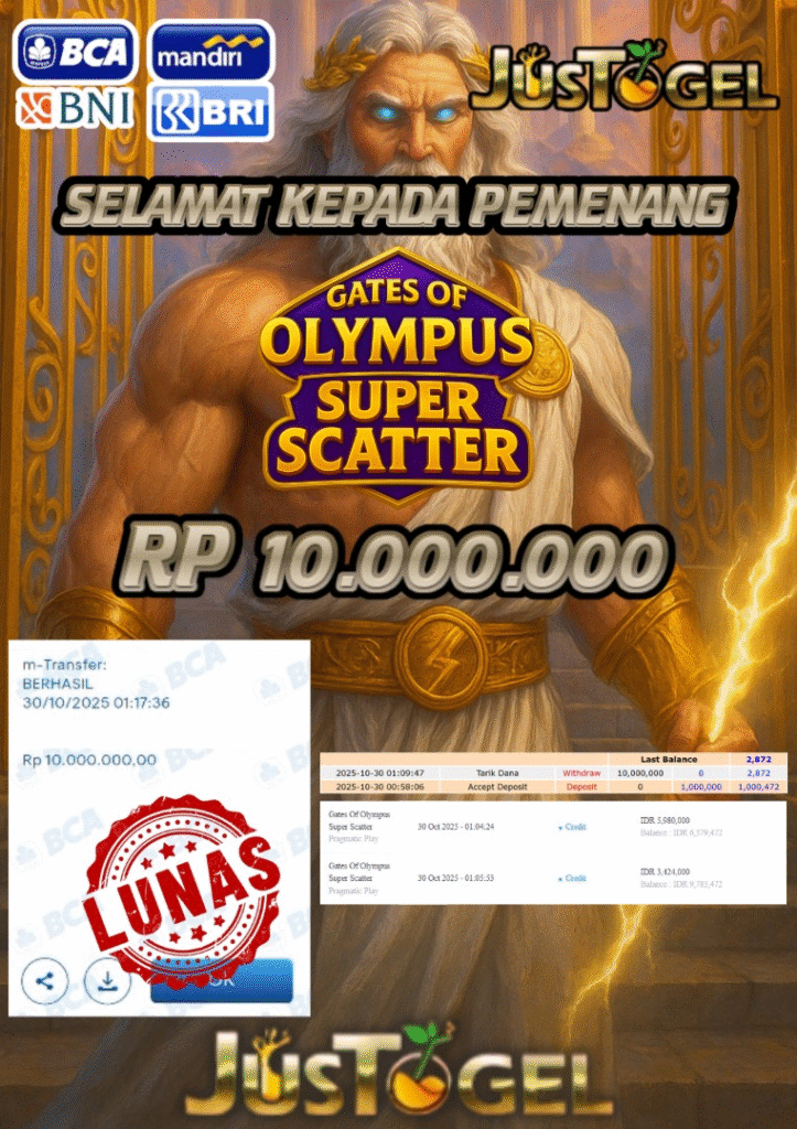 Selamat kepada User ID : JUR***ISMM Telah berhasil mendapatkan kemenangan besar pada Permainan JP SLOT GATES OF OLYMPUS SUPER SCATTER Dengan kemenangan Sebesar Rp 10.000.000,- Setelah mengisi formulir withdraw dengan kurung waktu hanya 5-10 menit pihak JUSTOGEL sudah melakukan transfer kepada pemilik User ID dan dana sudah dapat di cairkan oleh pemenang. Bukti pembayaran yang kami berikan merupakan bukti pembayaran yang SAH / VALID yang langung di dapatkan melaui tanda transfer transaksi dari Bank yang di tuju.