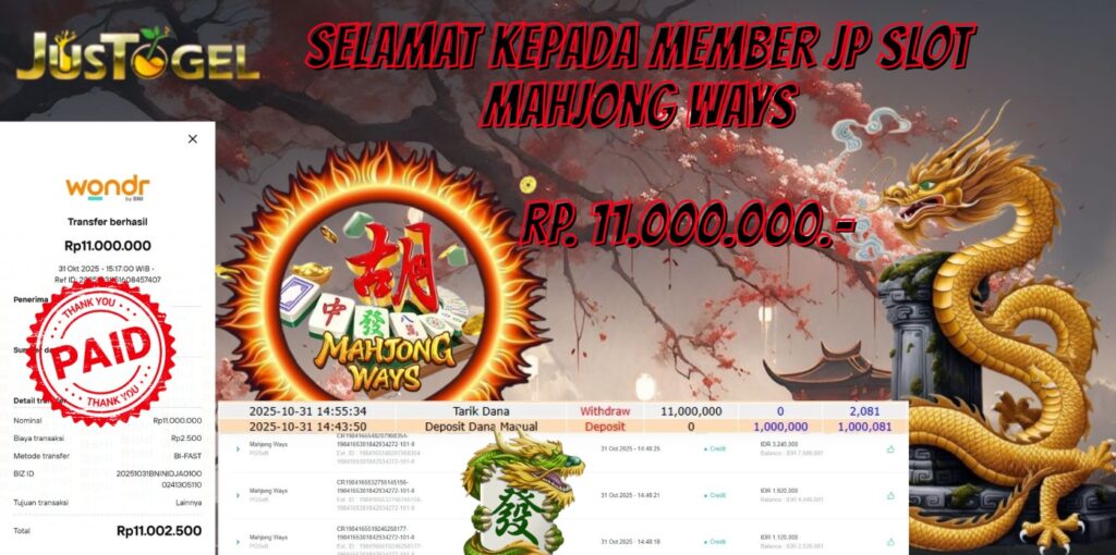 Selamat kepada User ID : PRA***SO Telah berhasil mendapatkan kemenangan besar pada Permainan JP SLOT MAHJONG WAYS Dengan kemenangan Sebesar Rp 11.000.000,- Setelah mengisi formulir withdraw dengan kurung waktu hanya 5-10 menit pihak JUSTOGEL sudah melakukan transfer kepada pemilik User ID dan dana sudah dapat di cairkan oleh pemenang. Bukti pembayaran yang kami berikan merupakan bukti pembayaran yang SAH / VALID yang langung di dapatkan melaui tanda transfer transaksi dari Bank yang di tuju.