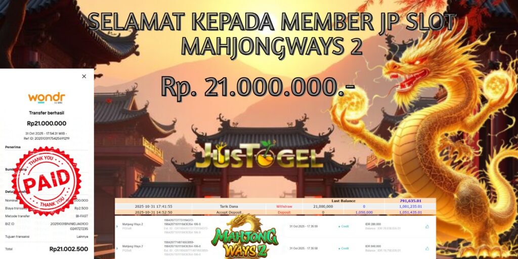 Selamat kepada User ID : JHO***18 Telah berhasil mendapatkan kemenangan besar pada Permainan JP SLOT MAHJONG WAYS 2 Dengan kemenangan Sebesar Rp 21.000.000,- Setelah mengisi formulir withdraw dengan kurung waktu hanya 5-10 menit pihak JUSTOGEL sudah melakukan transfer kepada pemilik User ID dan dana sudah dapat di cairkan oleh pemenang. Bukti pembayaran yang kami berikan merupakan bukti pembayaran yang SAH / VALID yang langung di dapatkan melaui tanda transfer transaksi dari Bank yang di tuju.