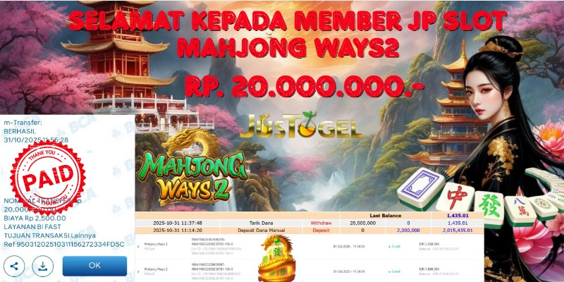 Selamat kepada User ID : JHO**18 Telah berhasil mendapatkan kemenangan besar pada Permainan JP SLOT MAHJONG WAYS 2 Dengan kemenangan Sebesar Rp 20.000.000,- Setelah mengisi formulir withdraw dengan kurung waktu hanya 5-10 menit pihak JUSTOGEL sudah melakukan transfer kepada pemilik User ID dan dana sudah dapat di cairkan oleh pemenang. Bukti pembayaran yang kami berikan merupakan bukti pembayaran yang SAH / VALID yang langung di dapatkan melaui tanda transfer transaksi dari Bank yang di tuju.