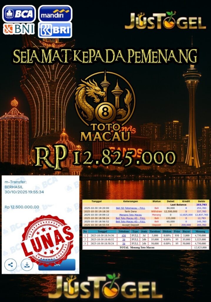 Selamat kepada User ID : LAR***UKA Telah berhasil mendapatkan kemenangan besar pada Permainan JP TOGEL TOTO MACAU  Dengan kemenangan Sebesar Rp 12.825.000,- Setelah mengisi formulir withdraw dengan kurung waktu hanya 5-10 menit pihak JUSTOGEL sudah melakukan transfer kepada pemilik User ID dan dana sudah dapat di cairkan oleh pemenang. Bukti pembayaran yang kami berikan merupakan bukti pembayaran yang SAH / VALID yang langung di dapatkan melaui tanda transfer transaksi dari Bank yang di tuju.