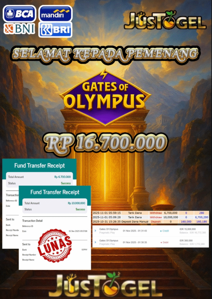 Selamat kepada User ID : WASS***YOU Telah berhasil mendapatkan kemenangan besar pada Permainan JP SLOT GATES OF OLYMPUS Dengan kemenangan Sebesar Rp 16.700.000,- Setelah mengisi formulir withdraw dengan kurung waktu hanya 5-10 menit pihak JUSTOGEL sudah melakukan transfer kepada pemilik User ID dan dana sudah dapat di cairkan oleh pemenang. Bukti pembayaran yang kami berikan merupakan bukti pembayaran yang SAH / VALID yang langung di dapatkan melaui tanda transfer transaksi dari Bank yang di tuju.