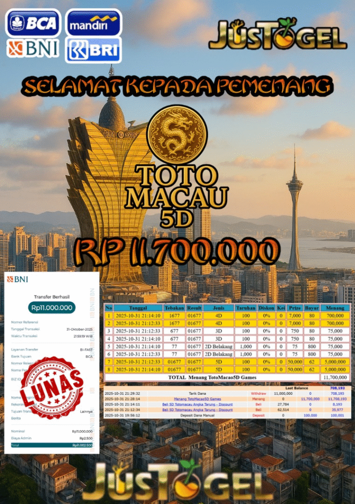 Selamat kepada User ID : LOS**GERR Telah berhasil mendapatkan kemenangan besar pada Permainan JP TOGEL TOTO MACAU 5D Dengan kemenangan Sebesar Rp 11.700.000,- Setelah mengisi formulir withdraw dengan kurung waktu hanya 5-10 menit pihak JUSTOGEL sudah melakukan transfer kepada pemilik User ID dan dana sudah dapat di cairkan oleh pemenang. Bukti pembayaran yang kami berikan merupakan bukti pembayaran yang SAH / VALID yang langung di dapatkan melaui tanda transfer transaksi dari Bank yang di tuju.