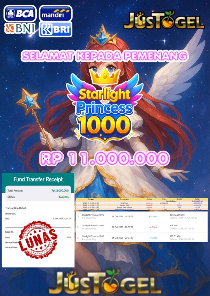 Selamat kepada User ID : JER***TA Telah berhasil mendapatkan kemenangan besar pada Permainan JP SLOT STARLIGHT PRINCESS 1000 Dengan kemenangan Sebesar Rp 11.000.000,- Setelah mengisi formulir withdraw dengan kurung waktu hanya 5-10 menit pihak JUSTOGEL sudah melakukan transfer kepada pemilik User ID dan dana sudah dapat di cairkan oleh pemenang. Bukti pembayaran yang kami berikan merupakan bukti pembayaran yang SAH / VALID yang langung di dapatkan melaui tanda transfer transaksi dari Bank yang di tuju.