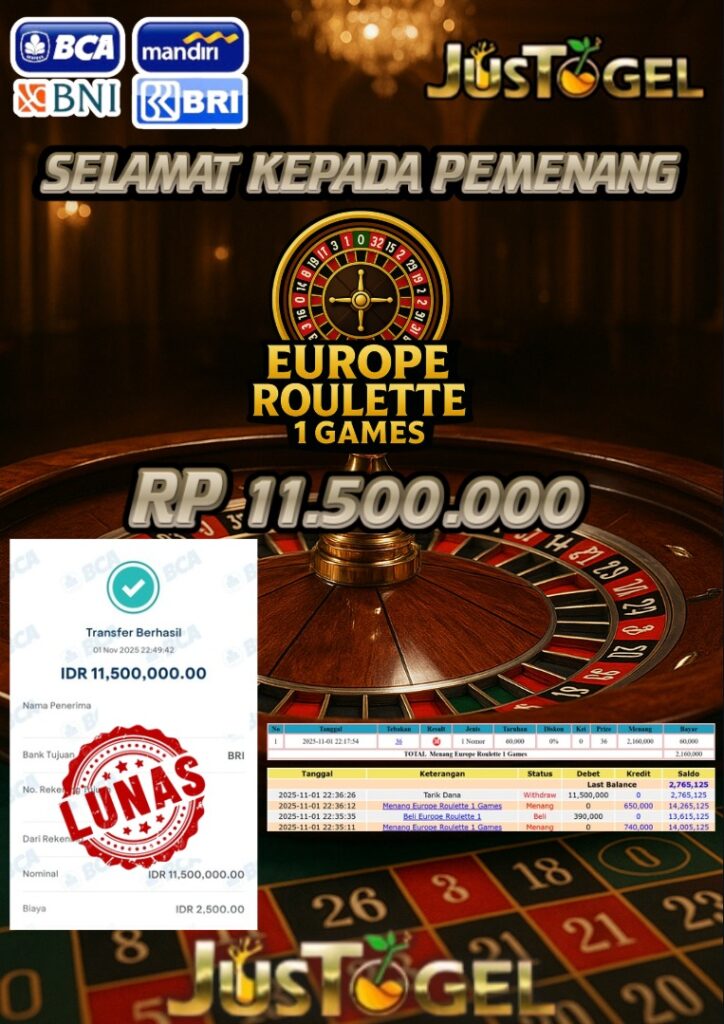 Selamat kepada User ID : MO***LIW Telah berhasil mendapatkan kemenangan besar pada Permainan JP LIVE GAME EUROPE ROULETTE 1 GAMES Dengan kemenangan Sebesar Rp 11.500.000,- Setelah mengisi formulir withdraw dengan kurung waktu hanya 5-10 menit pihak JUSTOGEL sudah melakukan transfer kepada pemilik User ID dan dana sudah dapat di cairkan oleh pemenang. Bukti pembayaran yang kami berikan merupakan bukti pembayaran yang SAH / VALID yang langung di dapatkan melaui tanda transfer transaksi dari Bank yang di tuju.
