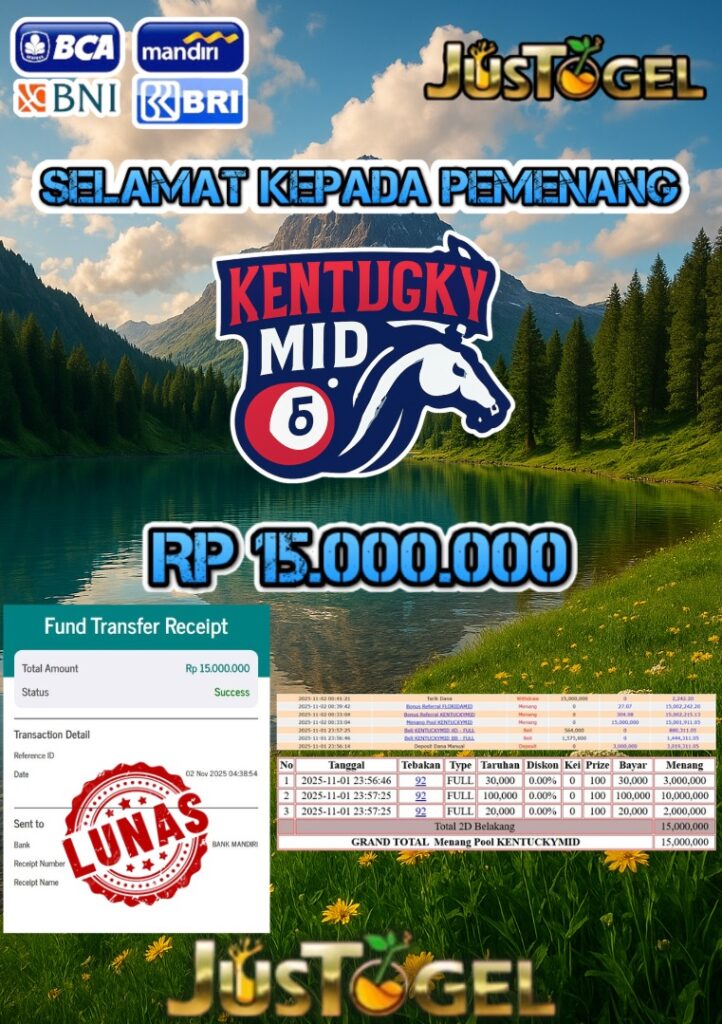 Selamat kepada User ID : WI**EHE Telah berhasil mendapatkan kemenangan besar pada Permainan JP TOGEL KENTUCKY MID Dengan kemenangan Sebesar Rp 15.000.000,- Setelah mengisi formulir withdraw dengan kurung waktu hanya 5-10 menit pihak JUSTOGEL sudah melakukan transfer kepada pemilik User ID dan dana sudah dapat di cairkan oleh pemenang. Bukti pembayaran yang kami berikan merupakan bukti pembayaran yang SAH / VALID yang langung di dapatkan melaui tanda transfer transaksi dari Bank yang di tuju.