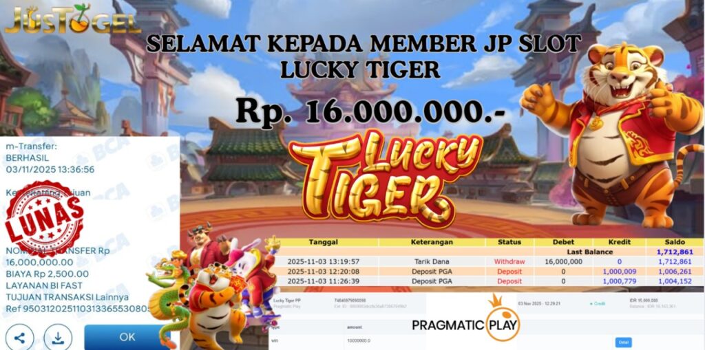 Selamat kepada User ID : HAD***AN Telah berhasil mendapatkan kemenangan besar pada Permainan JP SLOT LUCKY TIGER Dengan kemenangan Sebesar Rp 16.000.000,- Setelah mengisi formulir withdraw dengan kurung waktu hanya 5-10 menit pihak JUSTOGEL sudah melakukan transfer kepada pemilik User ID dan dana sudah dapat di cairkan oleh pemenang. Bukti pembayaran yang kami berikan merupakan bukti pembayaran yang SAH / VALID yang langung di dapatkan melaui tanda transfer transaksi dari Bank yang di tuju.