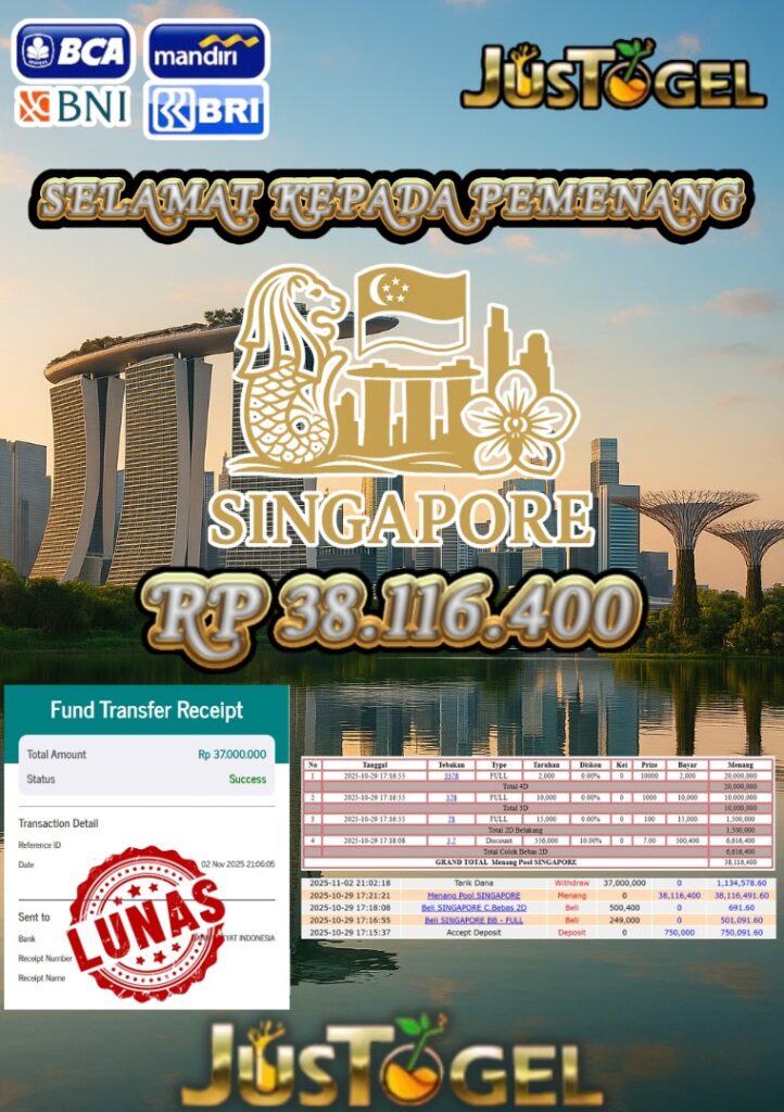 Selamat kepada User ID : VAN***SAN Telah berhasil mendapatkan kemenangan besar pada Permainan JP TOGEL SINGAPORE Dengan kemenangan Sebesar Rp 38.116.400,- Setelah mengisi formulir withdraw dengan kurung waktu hanya 5-10 menit pihak JUSTOGEL sudah melakukan transfer kepada pemilik User ID dan dana sudah dapat di cairkan oleh pemenang. Bukti pembayaran yang kami berikan merupakan bukti pembayaran yang SAH / VALID yang langung di dapatkan melaui tanda transfer transaksi dari Bank yang di tuju.
