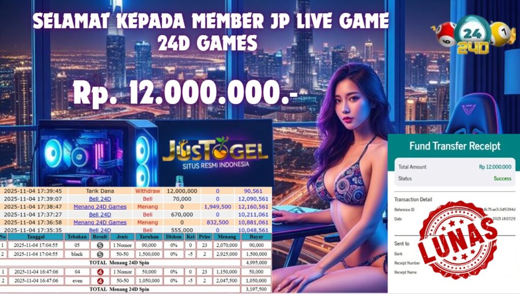 Selamat kepada User ID : BAY***99 Telah berhasil mendapatkan kemenangan besar pada Permainan JP LIVE GAME 24D GAMES Dengan kemenangan Sebesar Rp 12.000.000,- Setelah mengisi formulir withdraw dengan kurung waktu hanya 5-10 menit pihak JUSTOGEL sudah melakukan transfer kepada pemilik User ID dan dana sudah dapat di cairkan oleh pemenang. Bukti pembayaran yang kami berikan merupakan bukti pembayaran yang SAH / VALID yang langung di dapatkan melaui tanda transfer transaksi dari Bank yang di tuju.