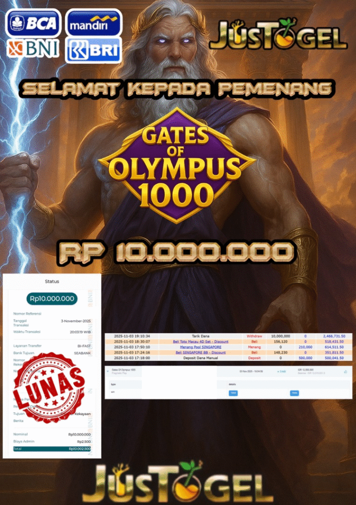 Selamat kepada User ID : LO***YA27 Telah berhasil mendapatkan kemenangan besar pada Permainan JP SLOT GATES OF OLYMPUS 1000 Dengan kemenangan Sebesar Rp 10.000.000,- Setelah mengisi formulir withdraw dengan kurung waktu hanya 5-10 menit pihak JUSTOGEL sudah melakukan transfer kepada pemilik User ID dan dana sudah dapat di cairkan oleh pemenang. Bukti pembayaran yang kami berikan merupakan bukti pembayaran yang SAH / VALID yang langung di dapatkan melaui tanda transfer transaksi dari Bank yang di tuju.