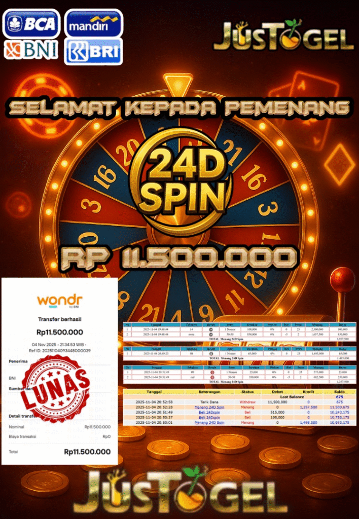 Selamat kepada User ID : LOL***SWE Telah berhasil mendapatkan kemenangan besar pada Permainan JP LIVE GAME 24D SPIN Dengan kemenangan Sebesar Rp 11.500.000,- Setelah mengisi formulir withdraw dengan kurung waktu hanya 5-10 menit pihak JUSTOGEL sudah melakukan transfer kepada pemilik User ID dan dana sudah dapat di cairkan oleh pemenang. Bukti pembayaran yang kami berikan merupakan bukti pembayaran yang SAH / VALID yang langung di dapatkan melaui tanda transfer transaksi dari Bank yang di tuju.