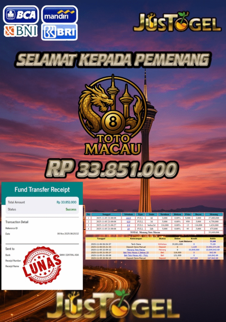 Selamat kepada User ID : LAS***AYU Telah berhasil mendapatkan kemenangan besar pada Permainan JP TOGEL TOTO MACAU Dengan kemenangan Sebesar Rp 33.851.000,- Setelah mengisi formulir withdraw dengan kurung waktu hanya 5-10 menit pihak JUSTOGEL sudah melakukan transfer kepada pemilik User ID dan dana sudah dapat di cairkan oleh pemenang. Bukti pembayaran yang kami berikan merupakan bukti pembayaran yang SAH / VALID yang langung di dapatkan melaui tanda transfer transaksi dari Bank yang di tuju.