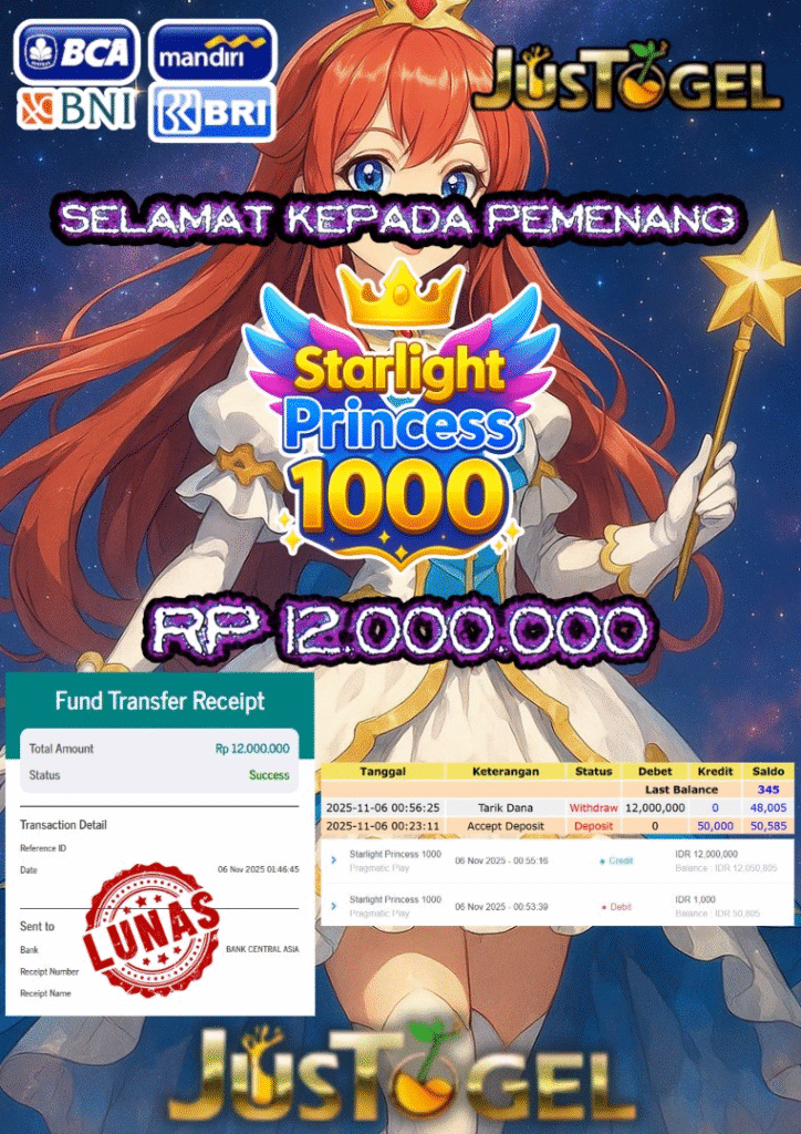 Selamat kepada User ID : LOM***PEH Telah berhasil mendapatkan kemenangan besar pada Permainan JP SLOT STARLIGHT PRINCESS 1000 Dengan kemenangan Sebesar Rp 12.000.000,- Setelah mengisi formulir withdraw dengan kurung waktu hanya 5-10 menit pihak JUSTOGEL sudah melakukan transfer kepada pemilik User ID dan dana sudah dapat di cairkan oleh pemenang. Bukti pembayaran yang kami berikan merupakan bukti pembayaran yang SAH / VALID yang langung di dapatkan melaui tanda transfer transaksi dari Bank yang di tuju.