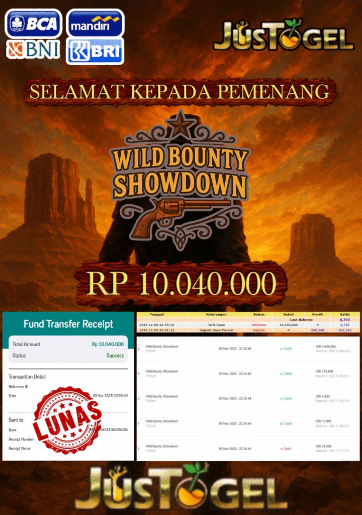Selamat kepada User ID : NYI***OKI Telah berhasil mendapatkan kemenangan besar pada Permainan JP SLOT WILD BOUNTY SHOWDOWN Dengan kemenangan Sebesar Rp 10.040.000,- Setelah mengisi formulir withdraw dengan kurung waktu hanya 5-10 menit pihak JUSTOGEL sudah melakukan transfer kepada pemilik User ID dan dana sudah dapat di cairkan oleh pemenang. Bukti pembayaran yang kami berikan merupakan bukti pembayaran yang SAH / VALID yang langung di dapatkan melaui tanda transfer transaksi dari Bank yang di tuju.